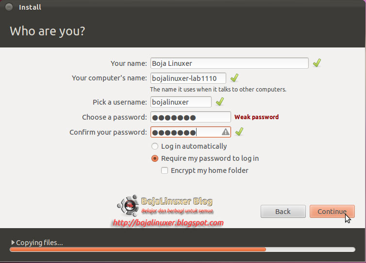 Langkah-langkah selanjutnya tinggal mengisi informasi pribadi yang dibutuhkan. Pada halam "Where are you?" tentukan lokasi tempat Anda berda ( Gambar 15 ), tekan "Continue" untuk melanjutkan. Pada halaman "Keyboard layout" pilih tata letak keyboard yang digunakan atau biarkan dalam keadaan default ( Gambar 16 ), tekan "Continue" untuk melanjutkan. Pada halaman "Who are you?" isi semua informasi pribadi yang diminta, "Your name:" isi dengan nama lengkap Anda, "Your computer's name:" isi dengan nama komputer yang Anda inginkan, "Pick a username:" tentukan username yang akan digunakan untuk login ke sistem, "Choose a password:" dan "Confirm your password:" isi dengan password yang akan Anda gunakan saat login. Dua opsi dibawahnya, pilih pada "Require my password to log in" dan tidak perlu mengaktifkan pilihan "Encript my home folder" jika Anda tidak tahu kegunaannya ( Gambar 17 ), tekan "Continue" untuk melanjutkan. Semua informasi yang diminta telah selesai kita tentukan, slideshow informasi akan ditampilkan, tinggal menanti instalasi diselesaikan ( Gambar 18 ). Instalasi selesai, pada dialog "Installaton complete" tekan tombol "Restart Now" ( Gambar 19 ), komputer akan direstart, ambil CD/DVD installer yang dikeluarkan lalu tekan enter.